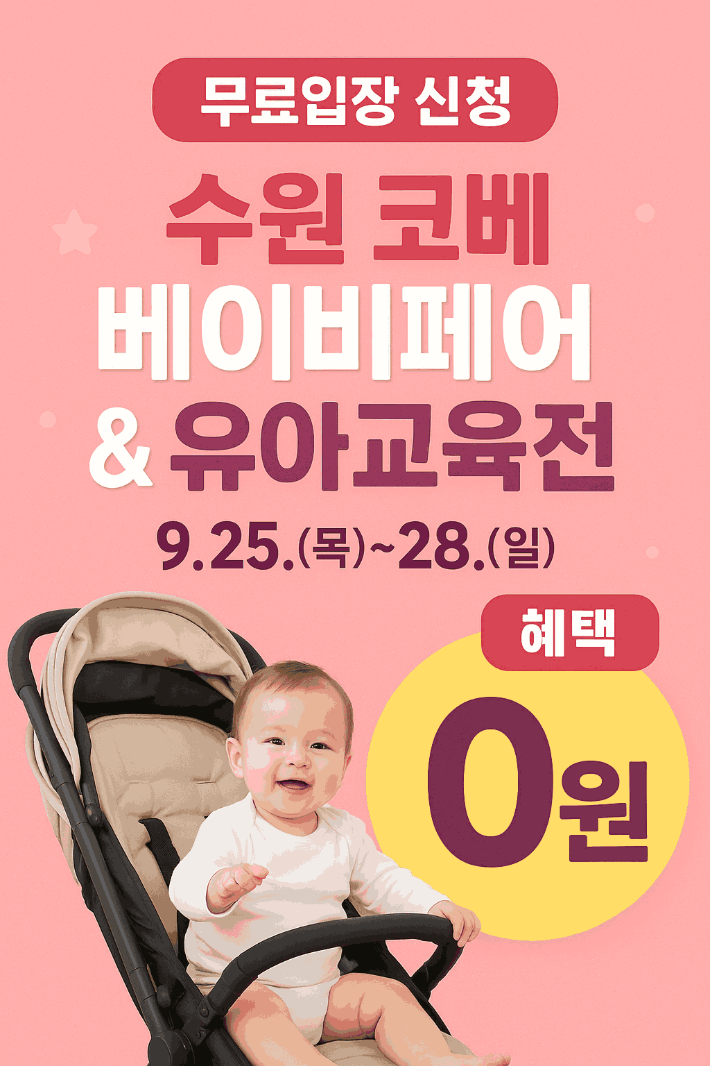 이 포스팅은 제휴마케팅 일환으로 판매 발생시 수수료를 제공 받습니다. “수원 코베 베이비페어&유아교육전 9월 25~28일 수원메쎄 개최! 무료입장 신청하고 유모차·카시트 5% 페이백, 100% 당첨 뽑기 이벤트, 선착순 선물까지 놓치지 마세요.” 임신·출산·육아 준비, 한 번에 해결할 기회!경기 최대 규모로 열리는 수원 코베 베이비페어 & 유아교육전(9.25~9.28)이 드디어 열립니다.예비 부모와 육아 부모 모두가 꼭 방문해야 할 육아·유아교육 필수 코스 … 더 읽기