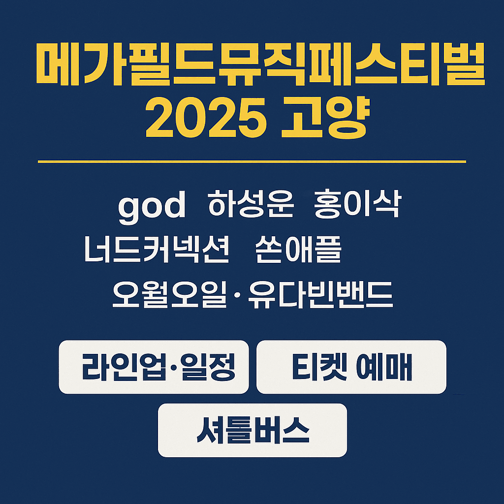 2025년 8월 30~31일 고양 킨텍스에서 열리는 메가필드뮤직페스티벌 2025 고양! god, 하성운, 너드커넥션 등 초호화 라인업부터 티켓 예매, 셔틀버스, 교통, 행사 꿀팁까지 한 번에 확인하세요.
