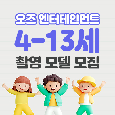 오즈엔터테인먼트 아역배우·키즈모델 오디션 모집! 서울·경기·인천·충주·춘천 지역 만 4세~13세 누구나 지원 가능. 드라마, 영화, 광고, 잡지모델 등 다양한 활동 기회와 넷플릭스·디즈니+·tvN 파트너사와 함께 꿈을 키워보세요.